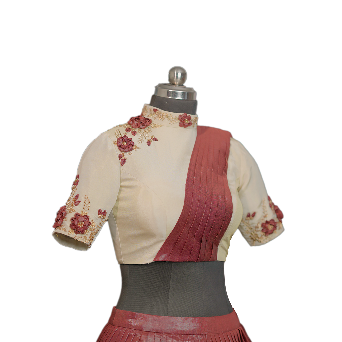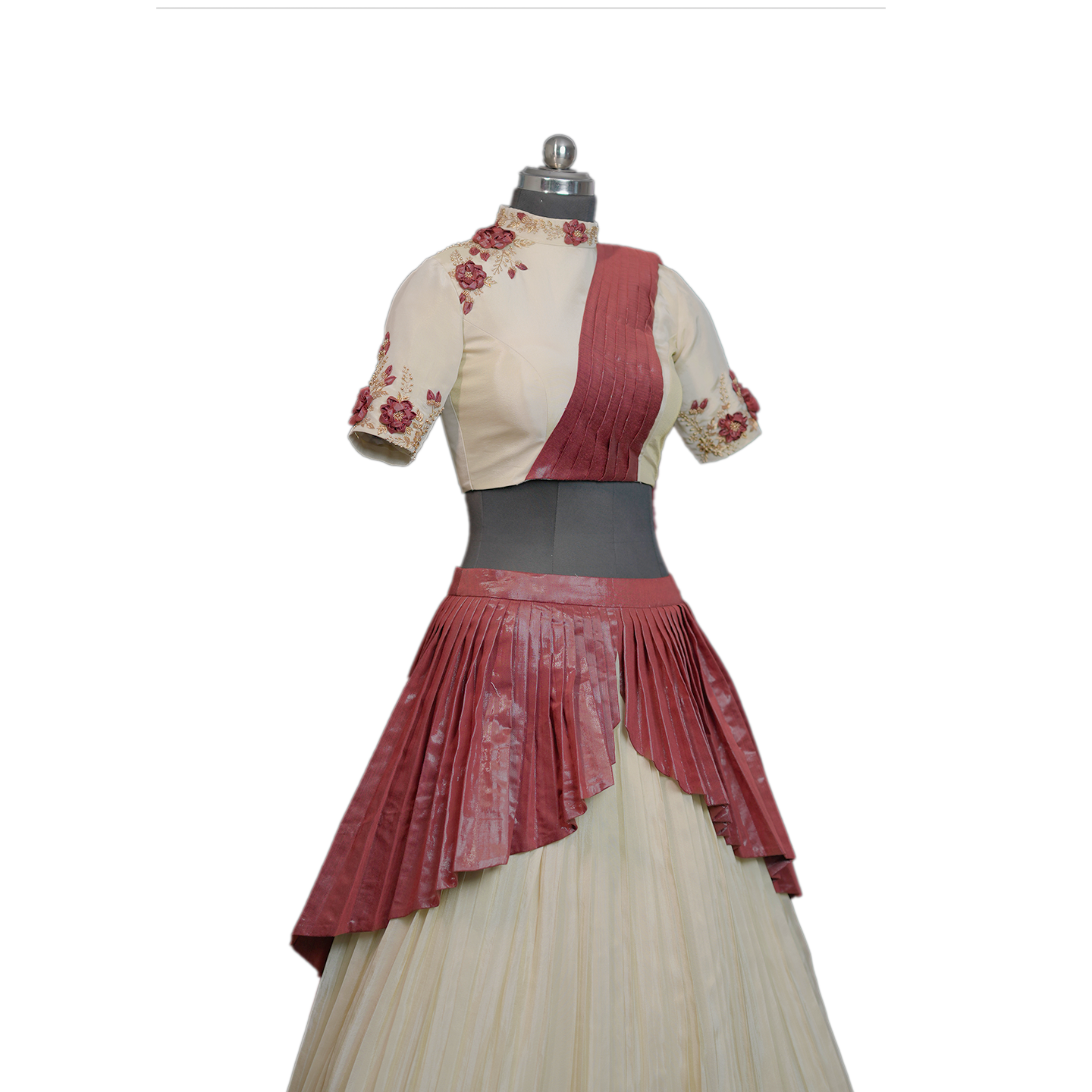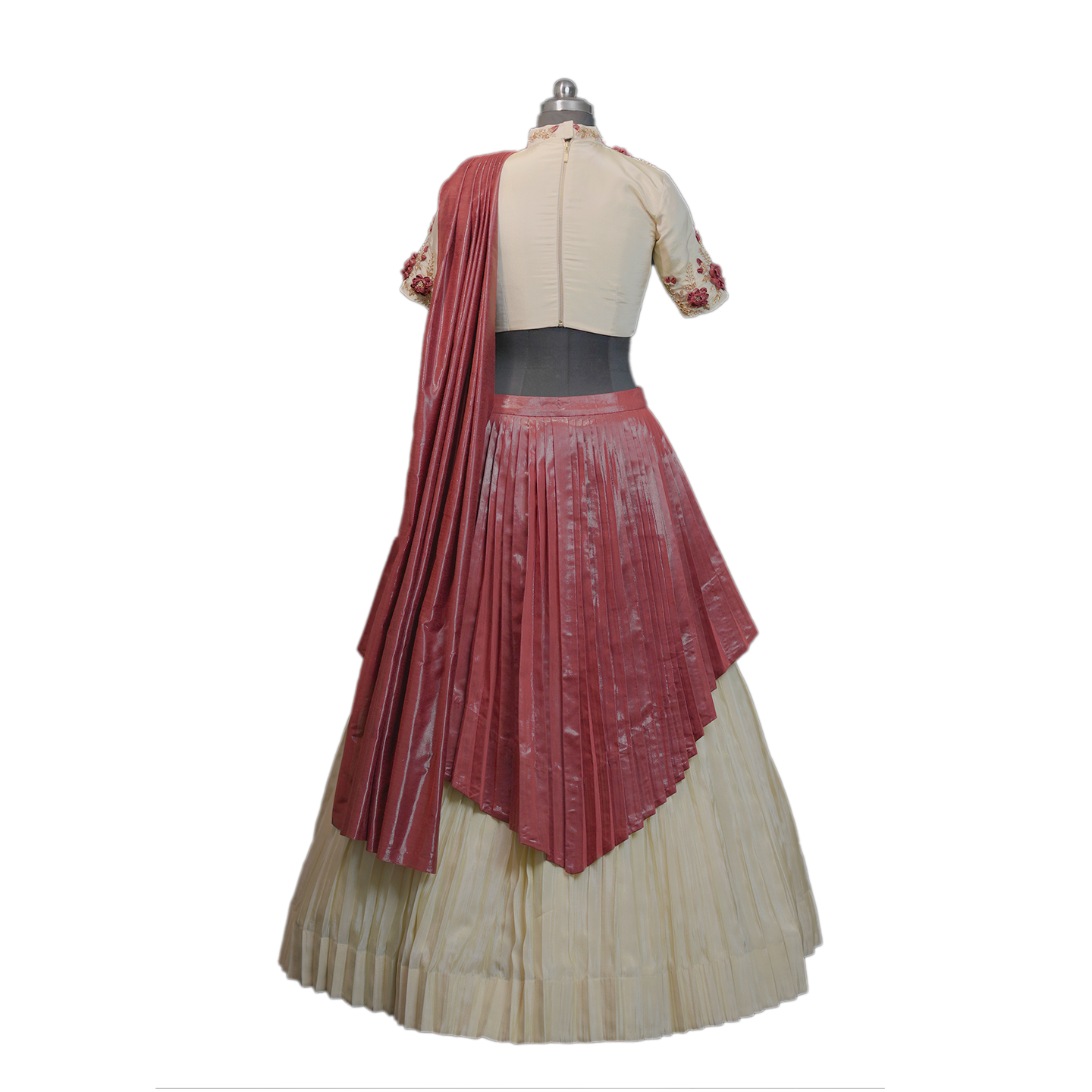 Pleated lehenga and crop top with attached dupatta